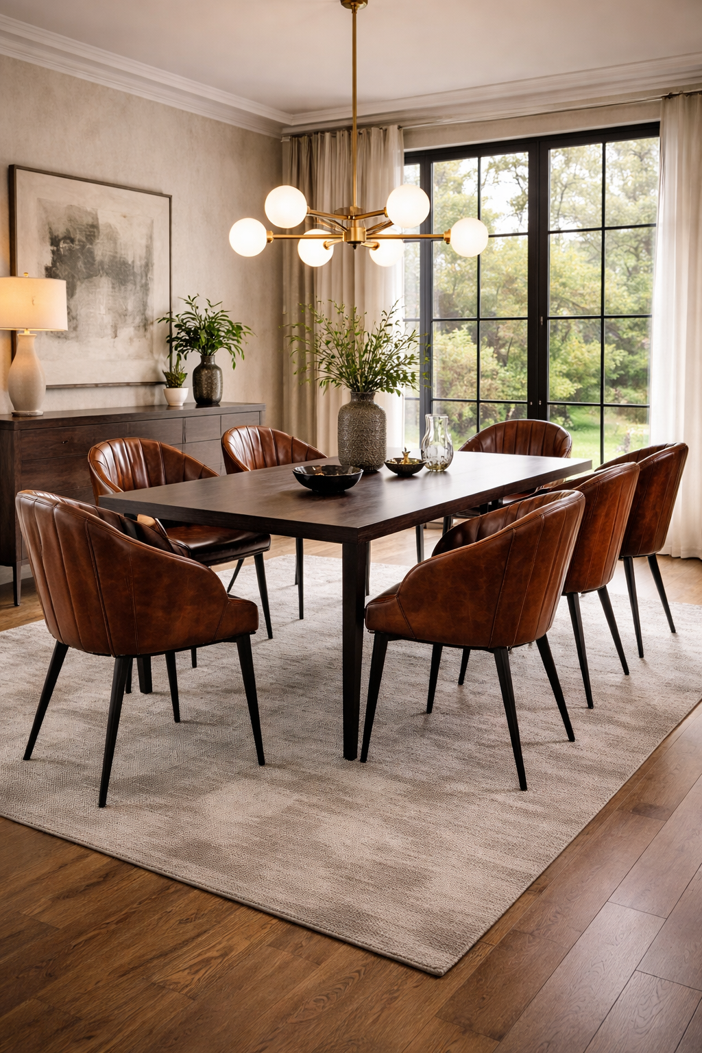 This luxury brown dining chair is designed for refined interiors where premium materials, comfort and timeless style matter. Upholstered in high-quality PU with an elegant leather-look finish, it brings warmth, depth and sophistication to the dining space, while the slim black steel legs create a striking modern contrast.