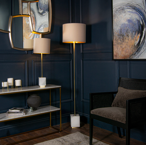 Explore luxury lighting crafted using marble as its foundation. The golden standing lamp will enchant you with its light marble base.