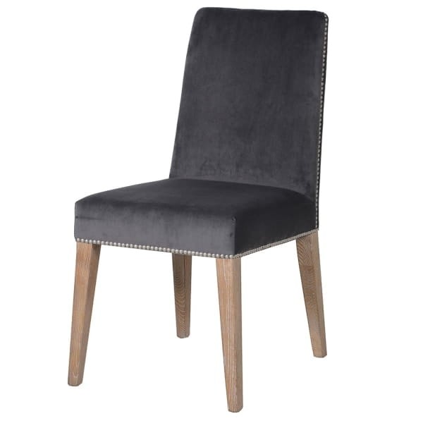 The sophisticated Eccleston grey dining chair boasts plush velvet upholstery adorned with silver accents. Simplicity and superior craftsmanship are the hallmarks of these upholstered chairs, harmonizing beautifully with their oak legs in a warm brown hue.