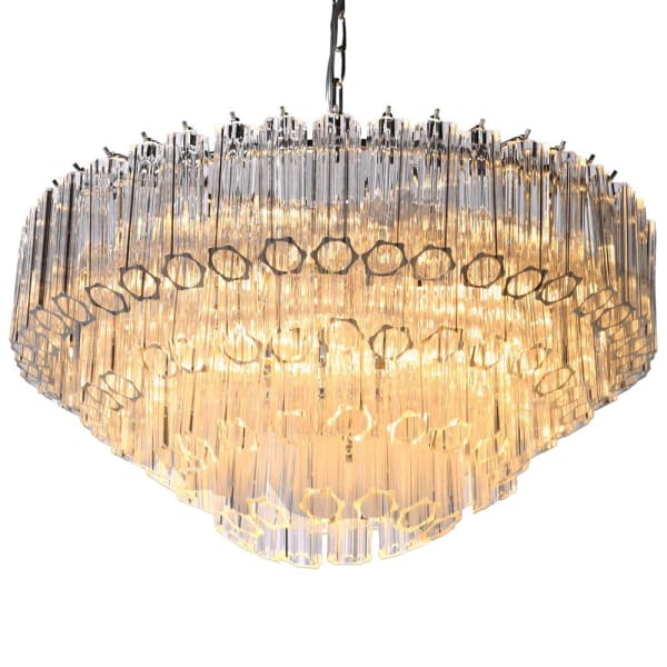 Its layered design combines contemporary style with timeless glamour, making it equally suited to bold modern interiors and more understated, elegant spaces. When illuminated, the glass elements beautifully reflect and diffuse light, creating a bright and eye-catching effect that enhances the atmosphere of the room.