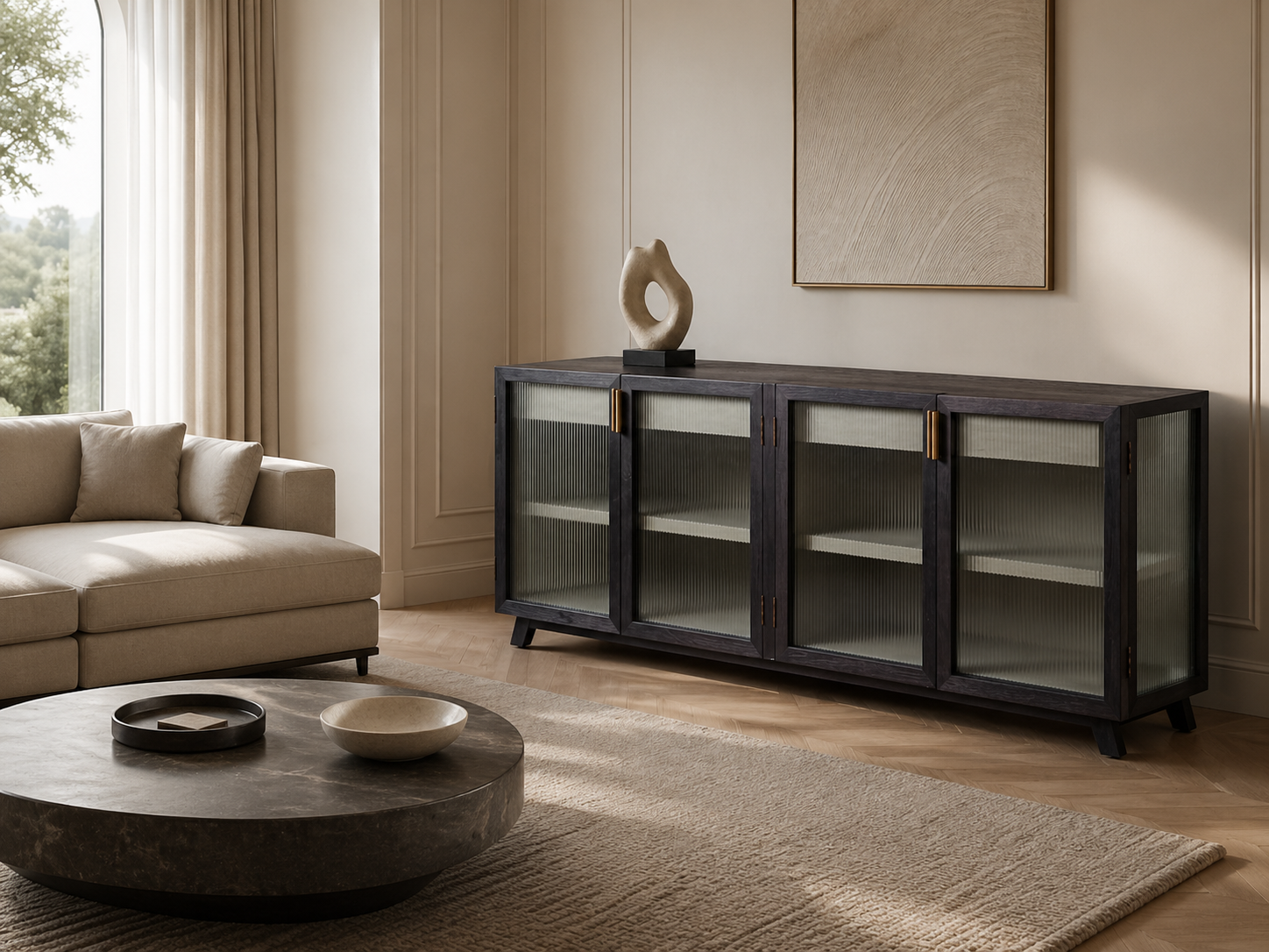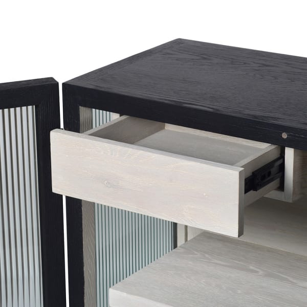 Fluted glass gives this sideboard a more layered and elegant appearance than a plain-fronted cabinet. It gently obscures the contents while still keeping the piece visually light, making it especially useful in a dining room, living room or study.
