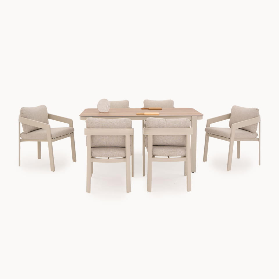This garden set for 6 people is perfect for family meals outdoors. The rectangular table is an ideal size for a larger group, while the beige cushions combined with the pebble-coloured frame create a cohesive and stylish look. The set's frame is made from durable, lightweight aluminium, which is coated with a protective layer (powder coating) to withstand changing weather conditions. Aluminium is resistant to rust, making it an excellent choice for outdoor furniture. An additional feature is the subtle, embossed details on the chair backs, highlighting the rounded shapes of the collection.
