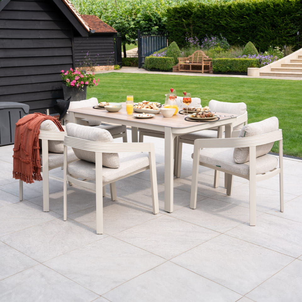 The Lyall dining set for 6 people with a rectangular table is a modern option with a softer design. Unlike typical garden furniture with sharp, straight lines, the Lyall collection features rounded shapes that lend a sense of lightness and elegance.