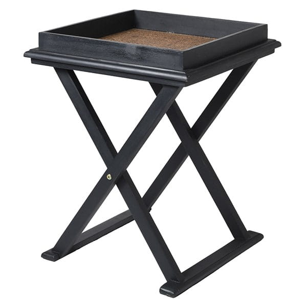 Beautifully crafted, this 54 cm wide square side table boasts a stunning black finish. The wooden living room table features an exquisite rattan top (woven from wicker) and crossed legs, adding a uniquely decorative touch.