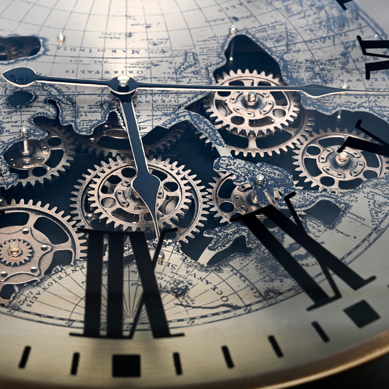 The Atlas side table is a distinctive designer side table for the living room that combines everyday practicality with striking décor. This industrial side table with a clock is designed for interiors where character, originality and attention to detail matter. Beneath the glass top you’ll find a decorative clock face with moving mechanisms and a stylised sepia-toned world map, creating a truly eye-catching visual effect.