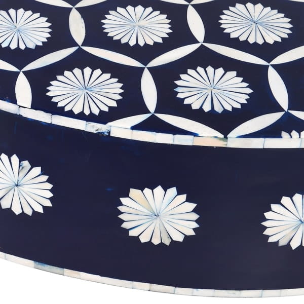 Belize Blue is an elegant round coffee table designed to bring character and refinement to the living room. Its decorative top in navy and white is paired with a striking gold base, creating a bold yet balanced look. Made using the distinctive bone inlay technique, each table has its own individual finish and unique decorative appeal. It is an excellent choice for those looking for a statement coffee table that combines practicality with standout design.