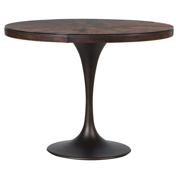 This exclusive round dining table, measuring 100 cm in diameter, is designed for interiors where exceptional finish, timeless elegance and distinctive design truly matter. The glass tabletop is finished in a striking surface inspired by natural leather in a deep brown shade, giving the piece a refined character and a sophisticated visual appeal.