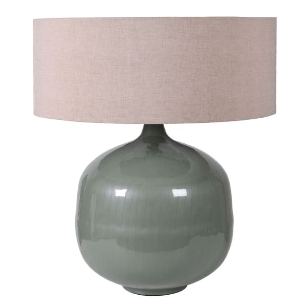 The hand-finished enamelled iron base is presented in cool green tones, giving the lamp a rich, characterful quality that feels both artistic and timeless. Paired with a classic beige cylindrical shade, it creates a balanced, considered look that sits effortlessly in both traditional and contemporary settings.