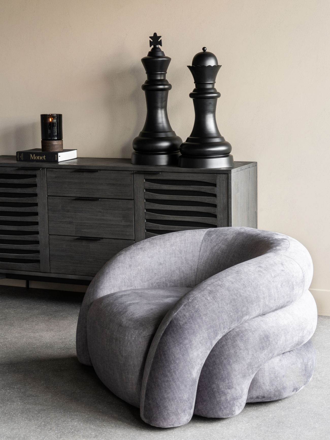 This black sculpture depicts a chess king and serves as a bold decorative accent for elegant interiors. Crafted from aluminium, it stands out for its high-quality craftsmanship and impressive scale, reaching a height of 68 cm.