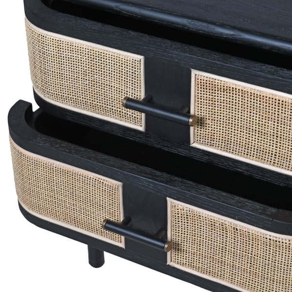 Leicester Bedside Table with Drawers 62 cm – Black Oak Cabinet with Natural Rattan Fronts