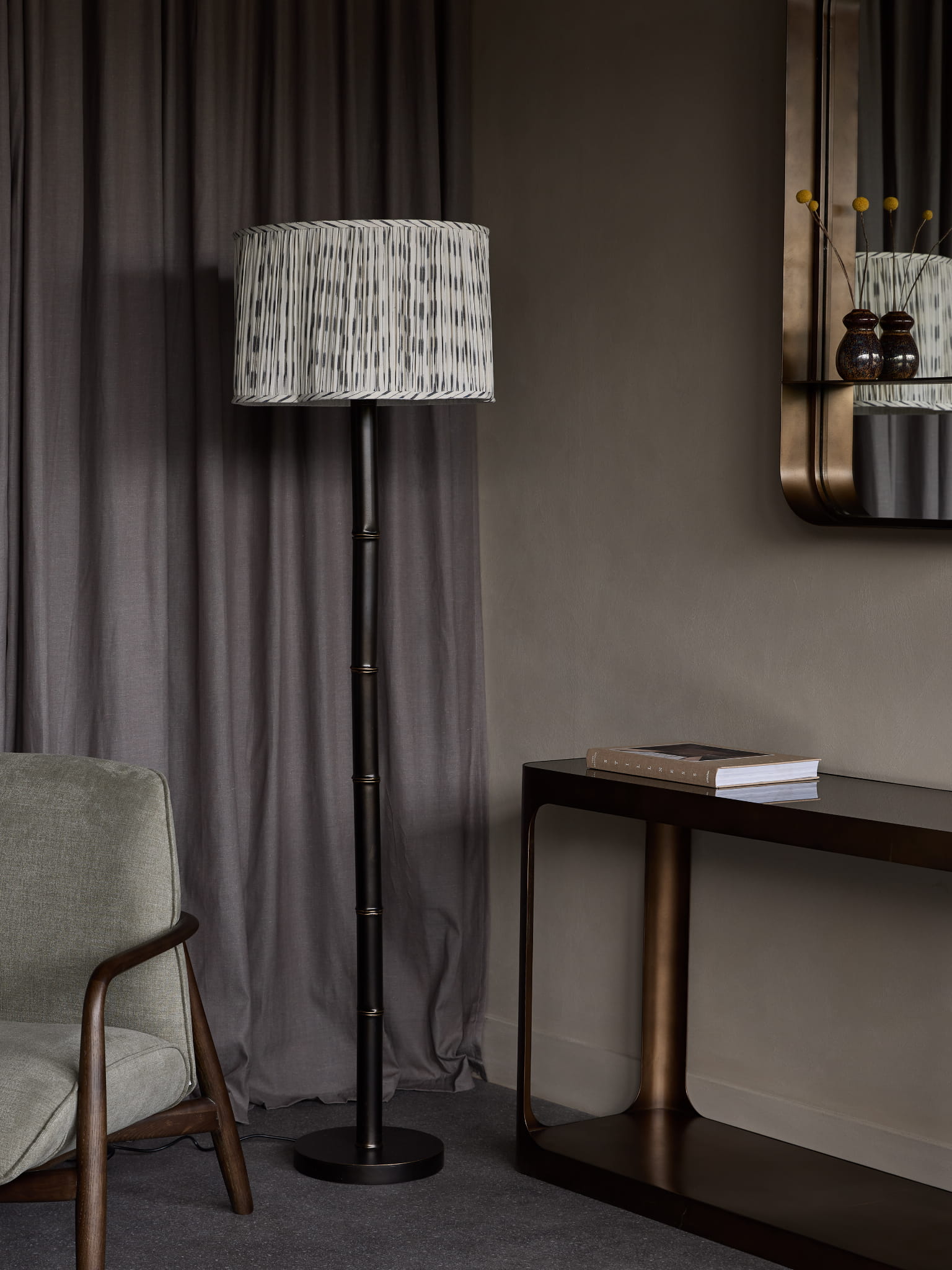 The Lexi floor lamp works beautifully in elegant, modern classic, boutique hotel, art deco and contemporary interiors. Its palette of black, brown and soft neutral tones makes it easy to style with sofas, armchairs, wood, velvet, linen and metallic accents.