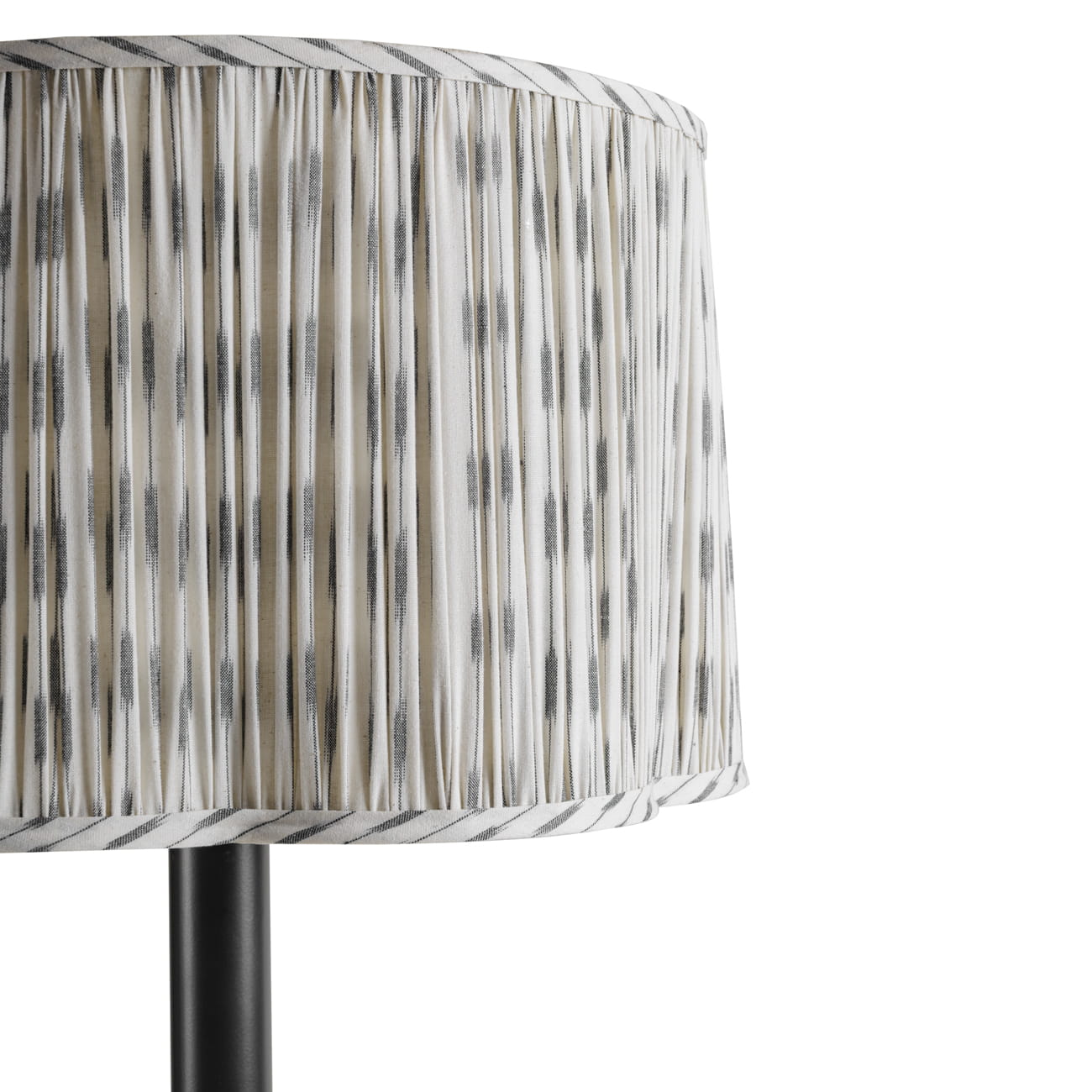 The grey pleated shade with an ikat-style design gives the lamp a distinctive look. This textured finish helps soften the light, creating a warm and inviting glow while adding a more decorative, luxurious feel.