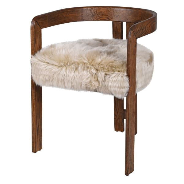 An exceptionally elegant and luxurious dining chair combining classic oak wood with natural sheepskin upholstery