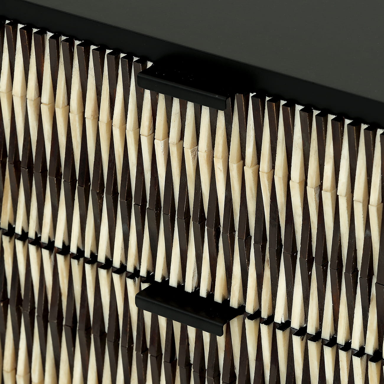The drawer front is adorned with handcrafted bone inlay in a contrasting black and cream pattern. The raised, rhythmic surface gently reflects the light, creating a subtle sense of movement and giving the piece a unique decorative appeal. It is a perfect example of the trend towards sculptural surfaces and tactile materials.