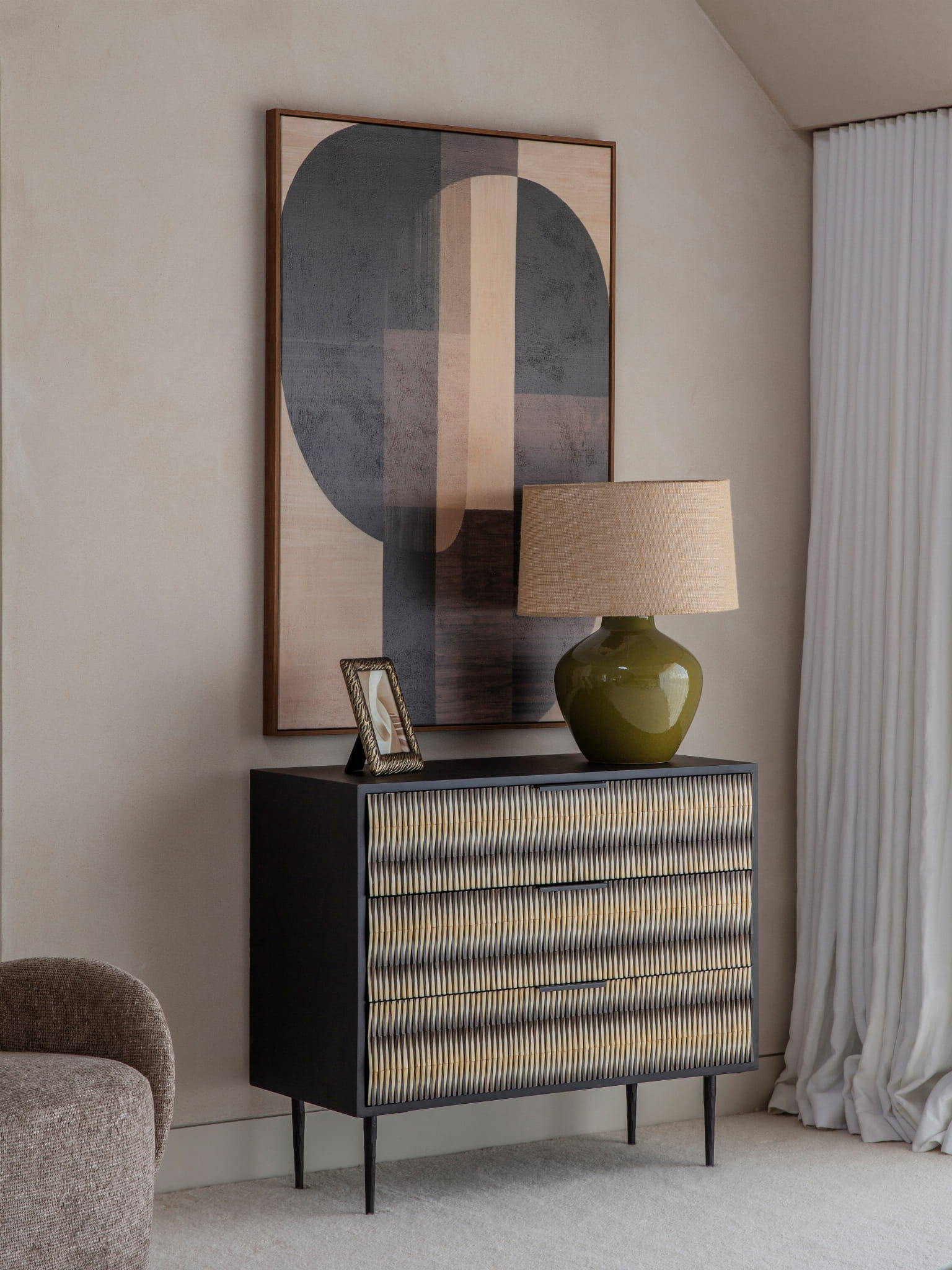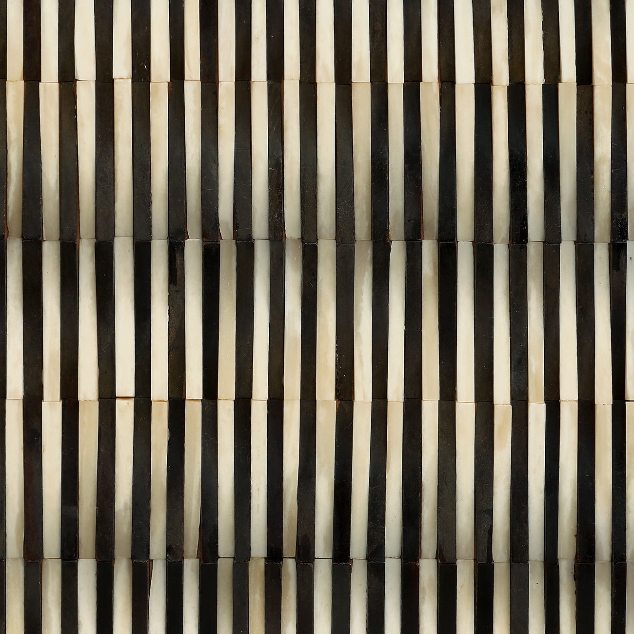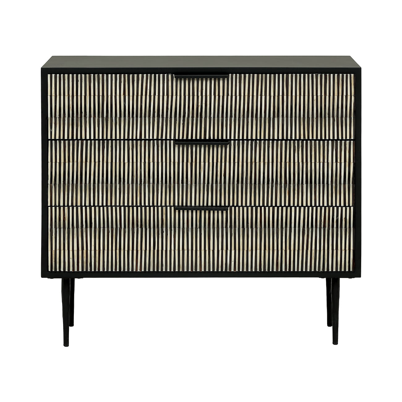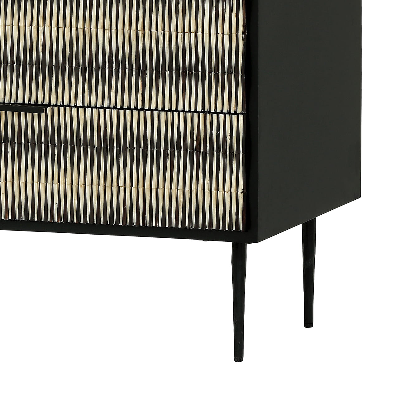 The fronts of the three drawers are decorated with handcrafted bone inlay in a rhythmic black and cream pattern. The raised texture gently reflects the light, creating a sense of movement and giving the chest a unique decorative character. It is a perfect example of current trends focused on sculptural surfaces and sophisticated simplicity.