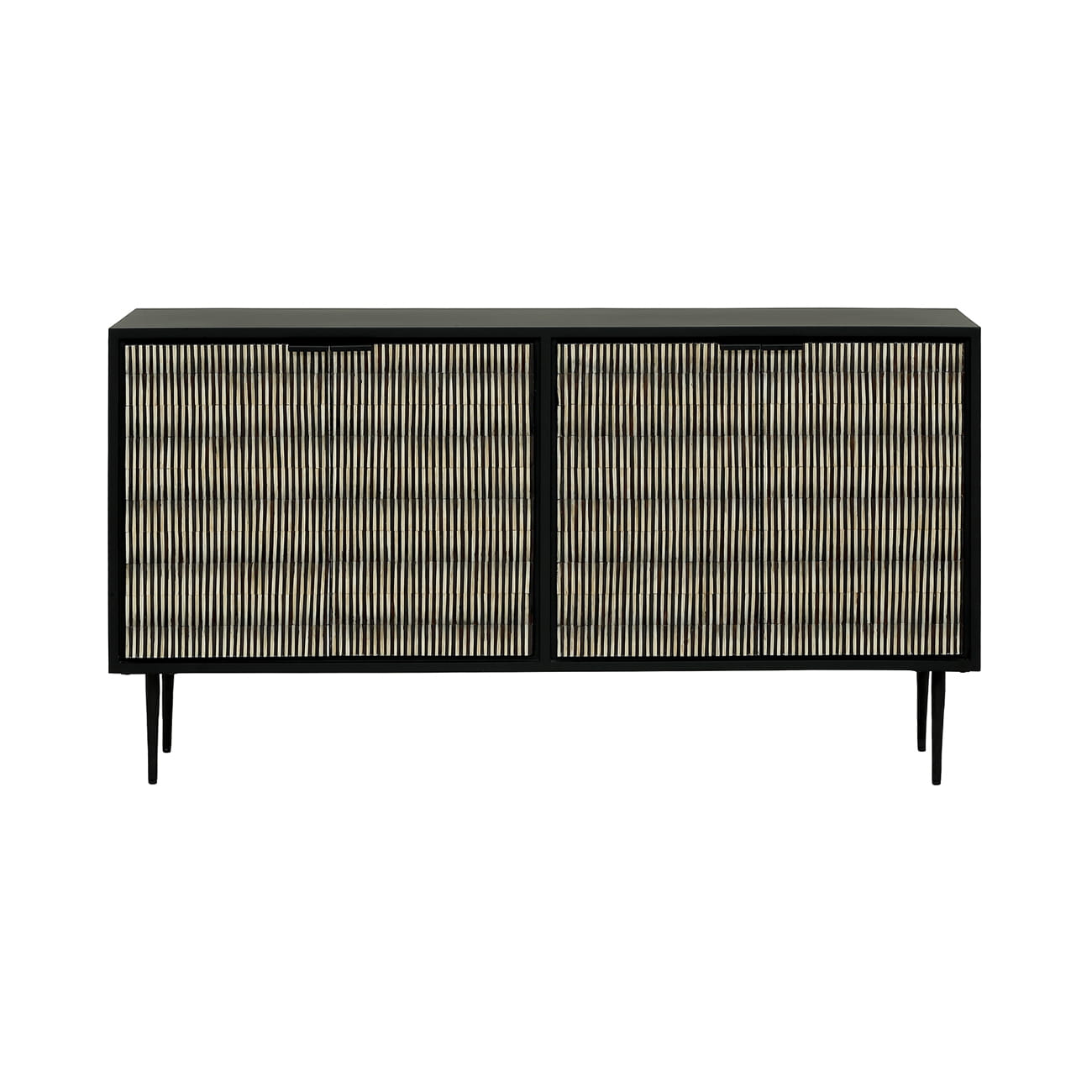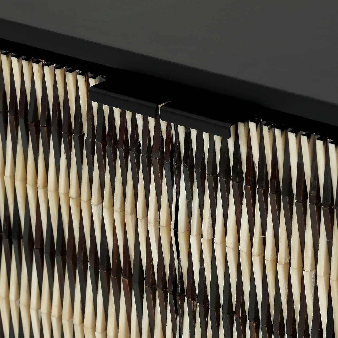 The four door fronts are finished with handcrafted bone inlay in a rhythmic black and cream pattern. The raised texture subtly reflects light and creates a gentle sense of movement, echoing current interior trends focused on sculptural surfaces, tactile materials and sophisticated simplicity.