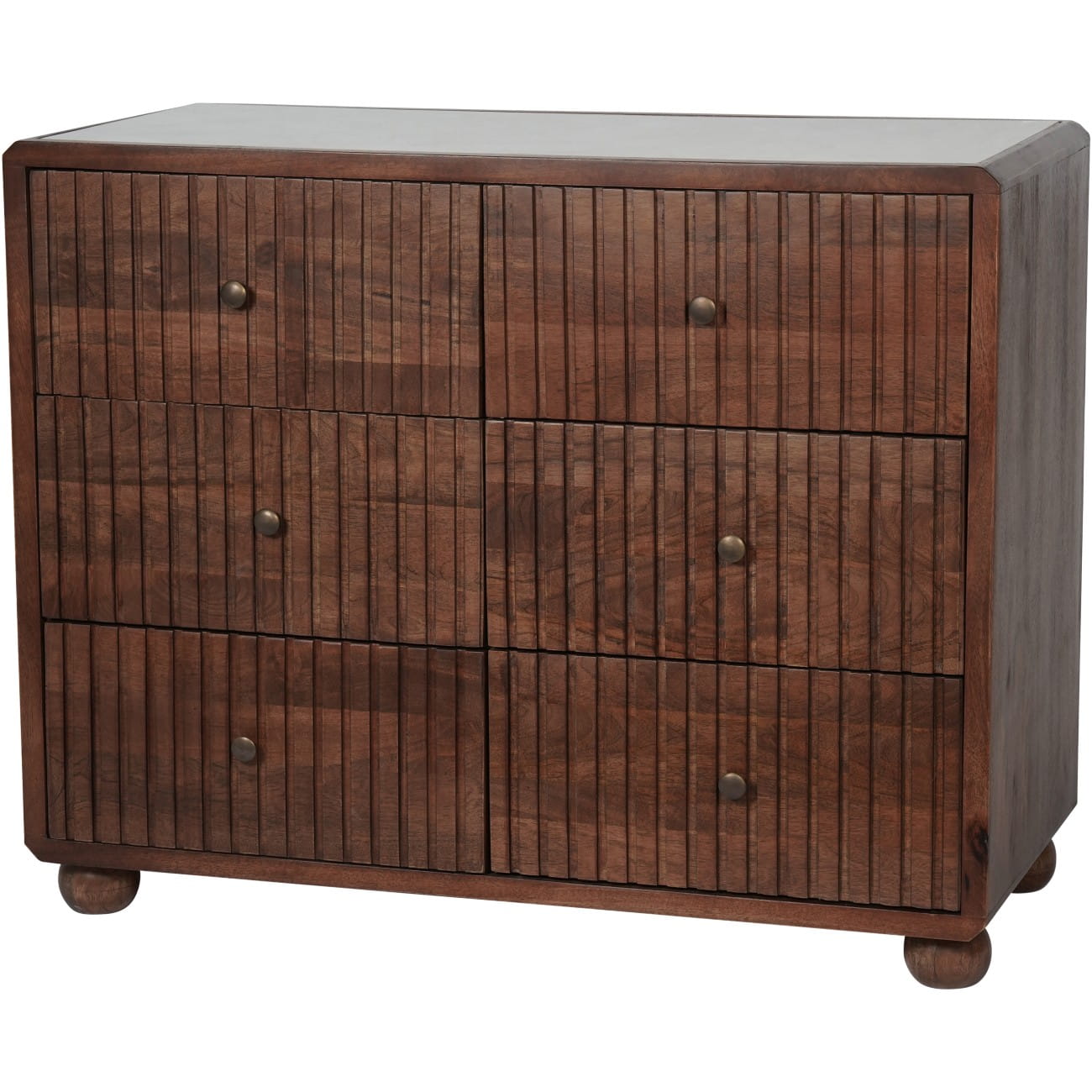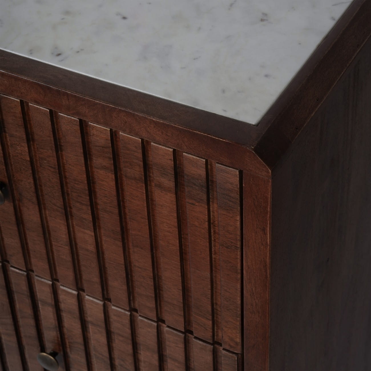The Montpelier Sideboard is a beautifully designed, sophisticated piece that brings timeless elegance to any space. Its distinctive design features intricately carved, fluted lines and soft, rounded contours, adding texture and a classic touch. This sideboard is equipped with six evenly spaced drawers arranged in a symmetrical three-by-three layout, offering both balance and functionality. Made from solid mango wood, it is topped with a luxurious off-white marble slab, enhancing its refined aesthetic