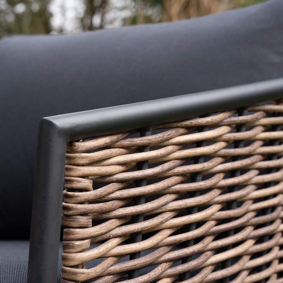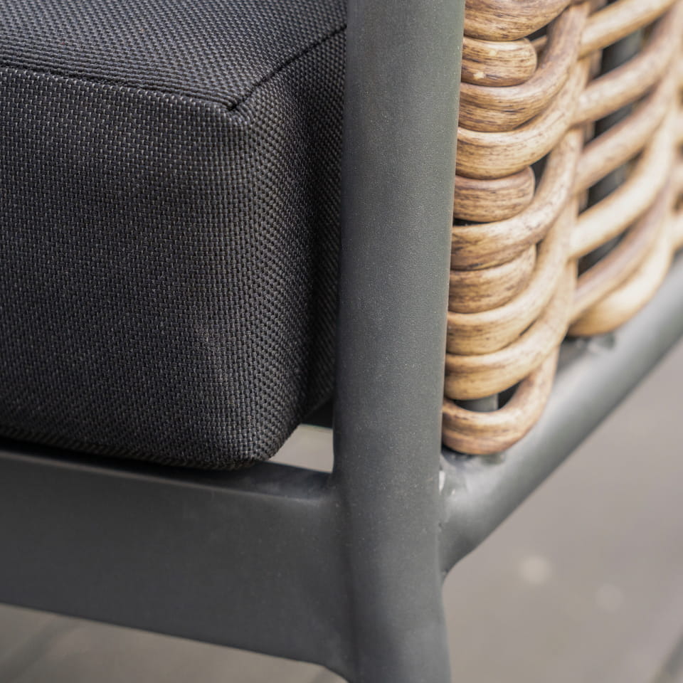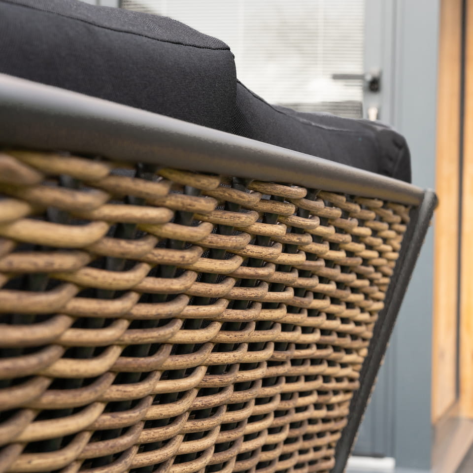 The Palomino collection blends the look of natural weave with a modern aluminium frame, making it equally well suited to contemporary outdoor spaces and more relaxed country-style settings. The powder-coated aluminium frame offers stability and durability for everyday use, while the chunky 10 mm round weave in a warm palomino brown shade gives the set an inviting and sophisticated finish.