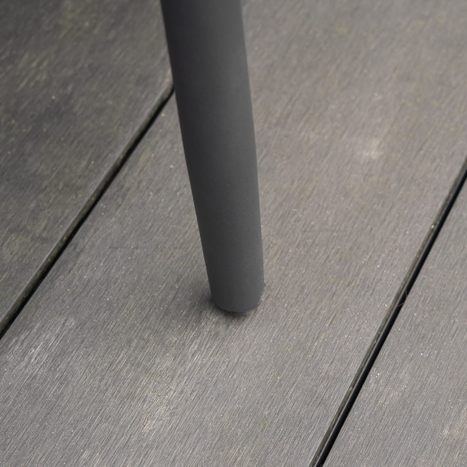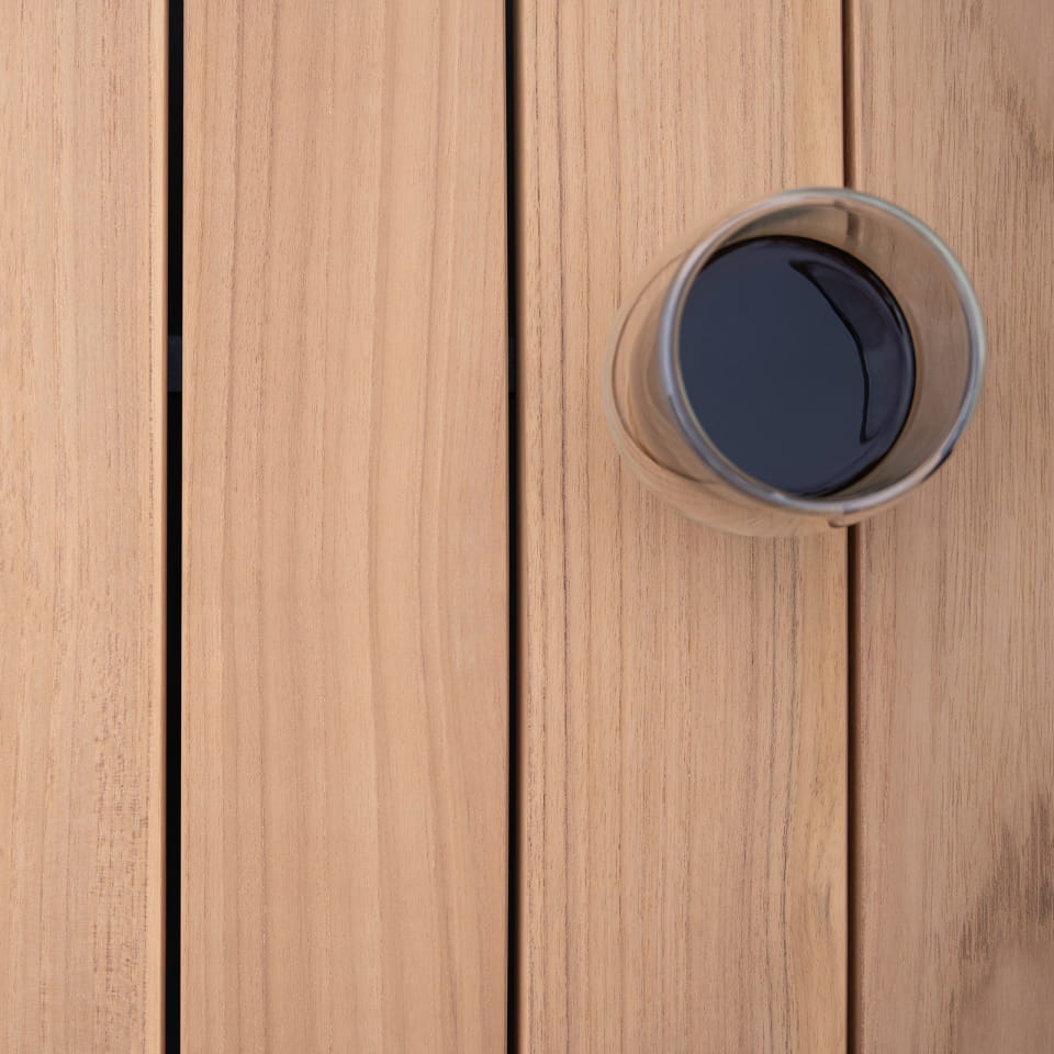 The square coffee table is finished with a natural teak wood top, adding a timeless and premium touch to the set. Teak is valued in outdoor furniture for its durability and natural beauty, although over time it may gradually change in colour and texture. This is a natural characteristic of the wood and part of its authentic appeal.