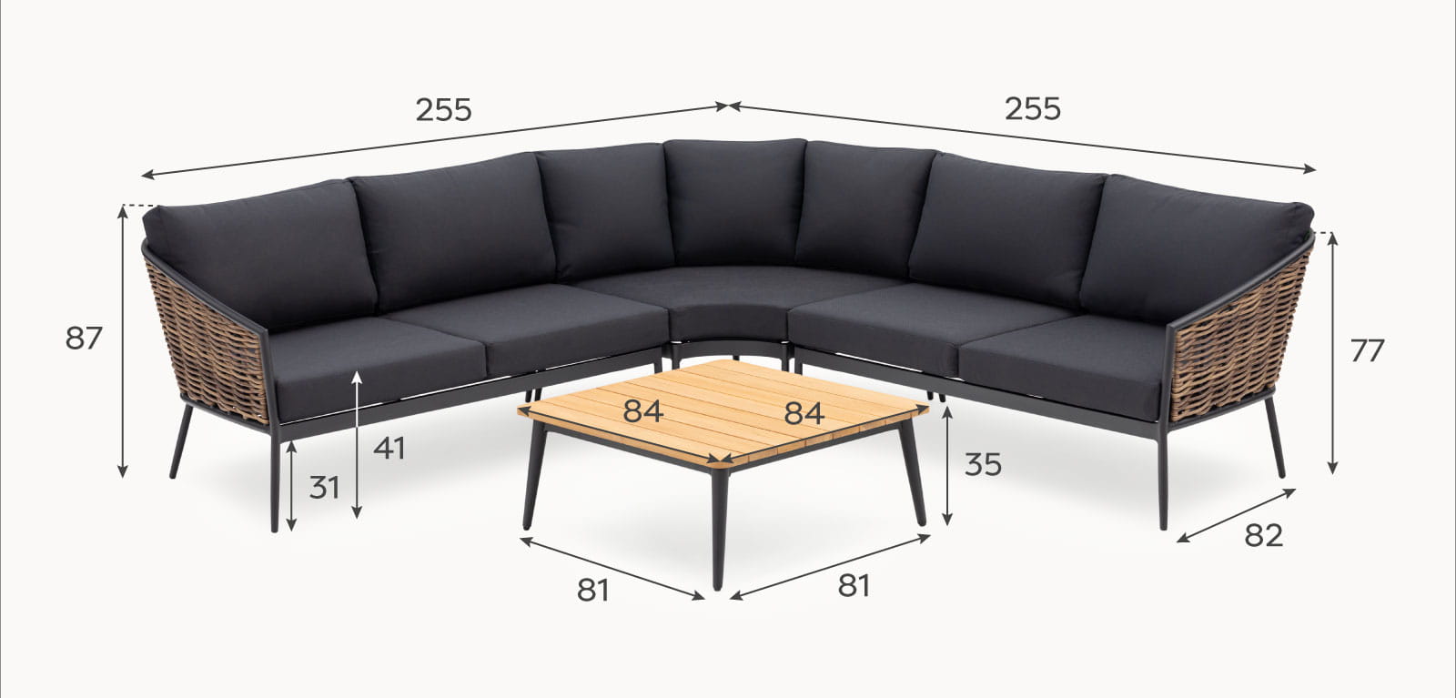 - 255 cm garden furniture set with L-shaped corner sofa and coffee table,