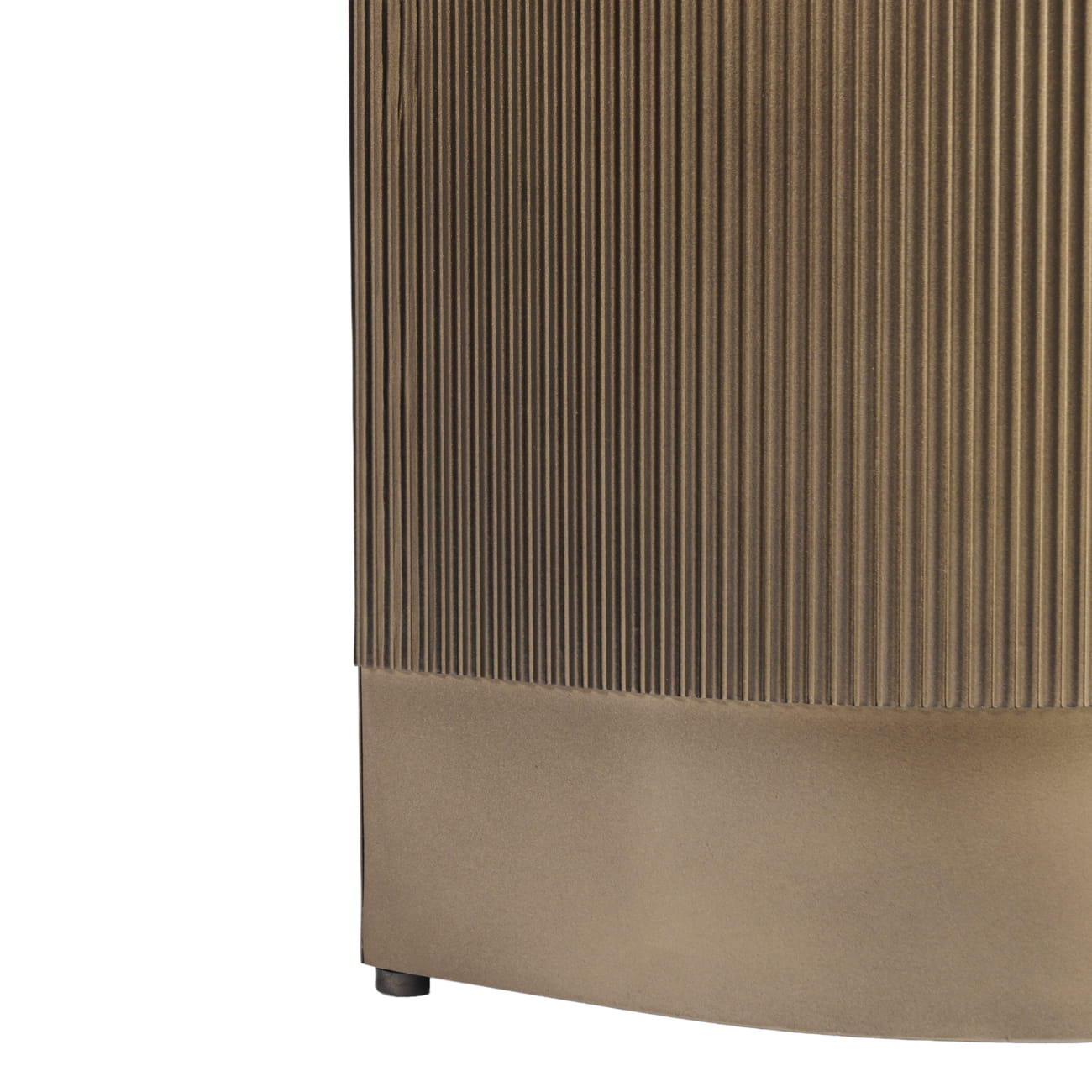 The structure is built around a slender metal frame in an elegant smoked gold finish. Ribbed, rounded corners soften the silhouette and add architectural lightness, making this premium office desk both practical and highly decorative.