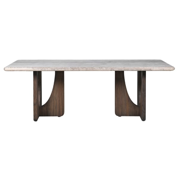 The Travertine Ash dining table combines timeless elegance with modern form. Its impressive 220 cm tabletop is crafted from grey travertine stone, featuring a subtly irregular texture that makes each piece unique. Supported by two sculptural ash wood legs, adorned with vertical grooves and a distinctive semi-circular cut-out, this table offers a striking balance of contemporary style and lasting sophistication.