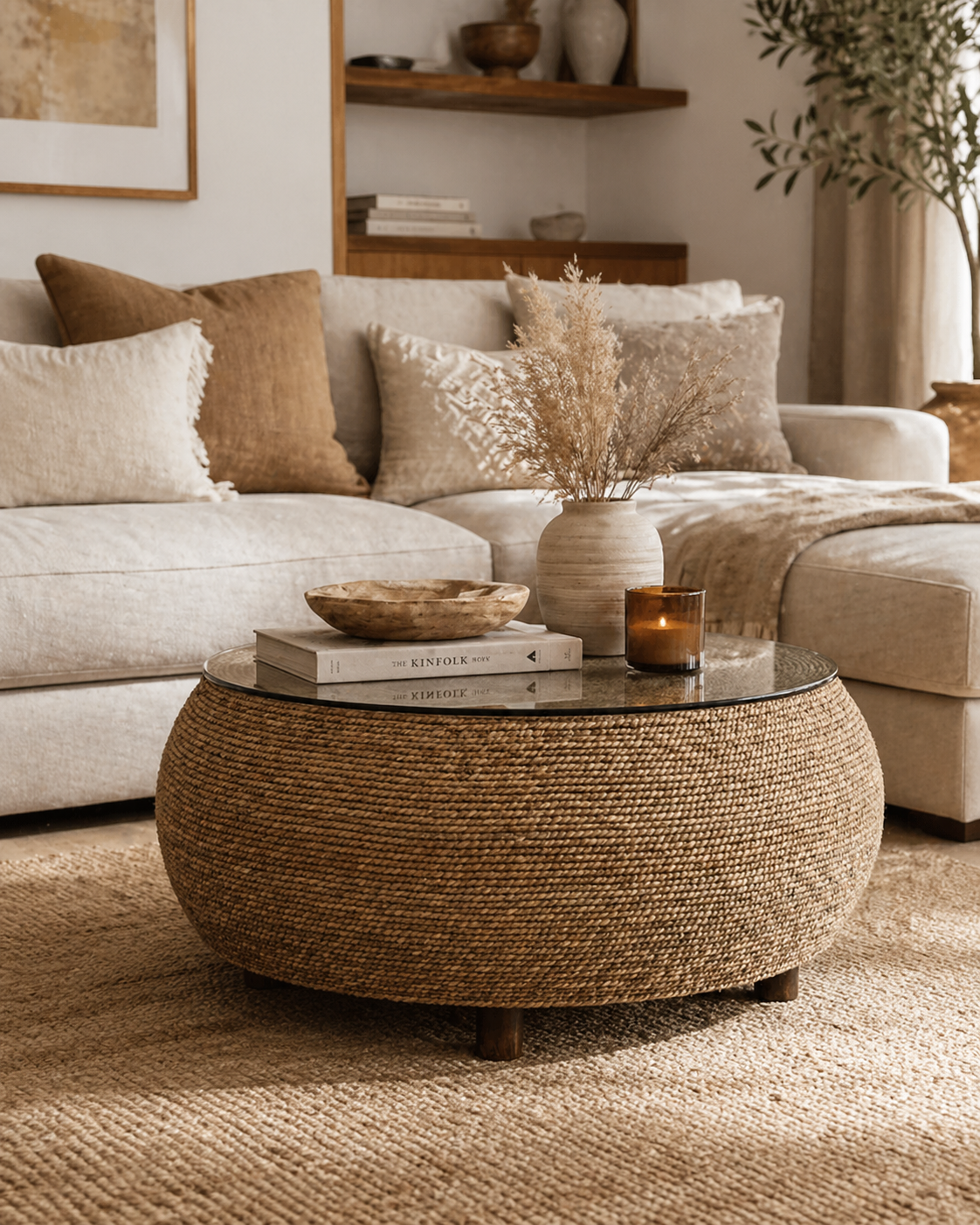 A seagrass coffee table is ideal for interiors with a natural, light and welcoming feel. It works perfectly as a living room coffee table, serving as both a practical piece of furniture and a decorative accent. A boho coffee table also makes a beautiful addition to a bedroom, guest room or a relaxation area on a covered terrace.