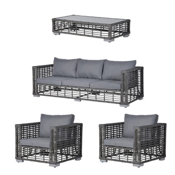 This set is a strong choice for anyone looking for a complete outdoor seating arrangement without having to match separate pieces. The 3-seater sofa, two armchairs and tempered glass coffee table create a practical and stylish garden lounge area, while the PE rattan, aluminium detailing and soft cushions give the set comfort, texture and a refined outdoor look.