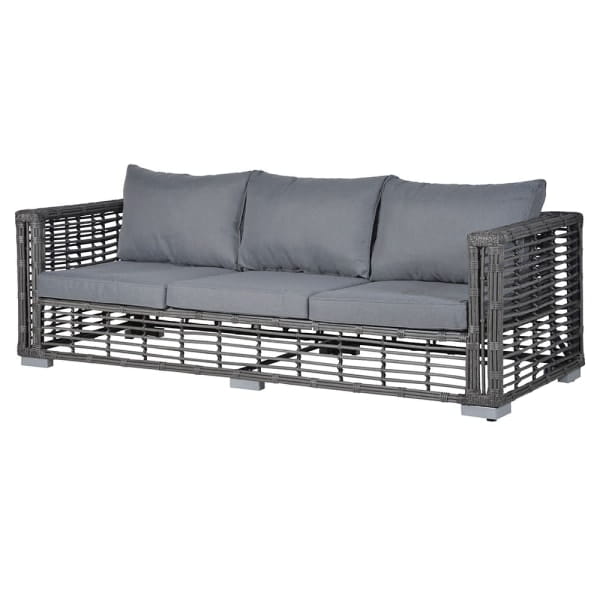 Each piece is made from PE rattan woven in a decorative pattern, with silver aluminium detailing for a refined modern finish. The grey and brown colour palette gives the set a natural yet polished look, while the grey linen-covered cushions add comfort and soften the overall design.