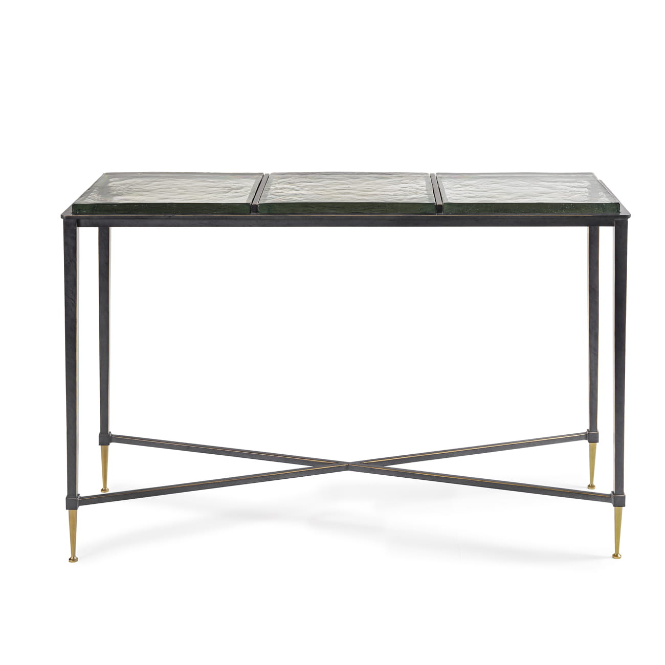 The console top consists of three panels made from thick, 18 mm textured glass with a brick-pattern finish. Subtle variations in the surface pattern give each piece a unique character and highlight the craftsmanship behind its design.