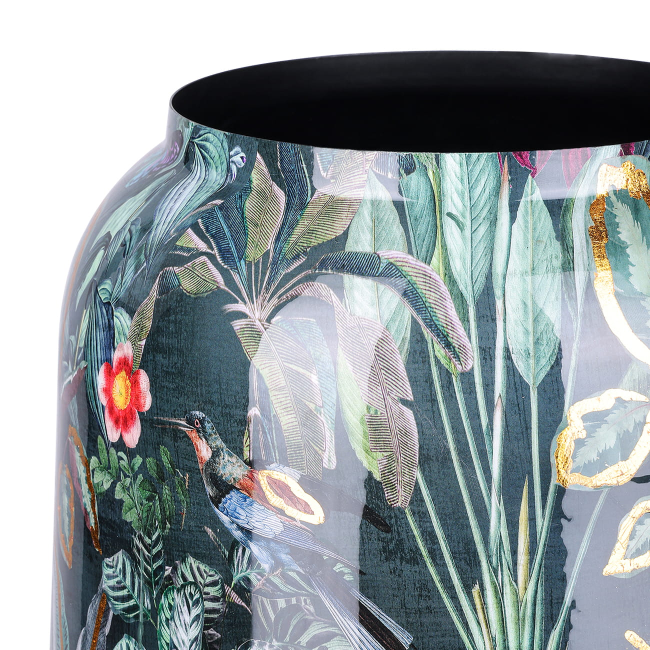 The detailed jungle motif blends tropical foliage, animal-inspired accents and vivid colours to create a rich and eye-catching design. Lush botanical patterns surround a central leopard figure, giving the vase a distinctive exotic look. The enamelled finish enhances the colours and adds a polished decorative surface, making this metal planter vase ideal for interiors that embrace bold styling and expressive details.